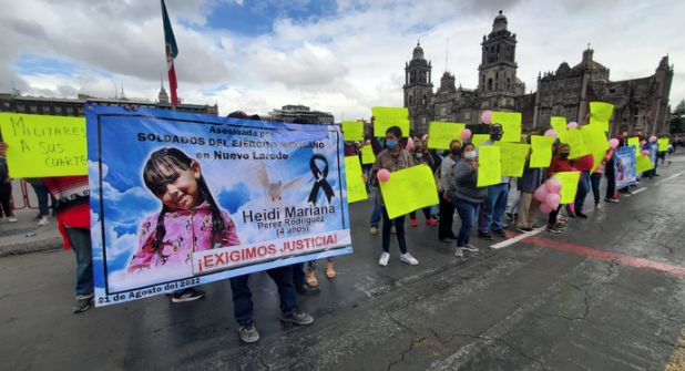 Ciudad de México, a 8 de septiembre de 2022.- La madre de la pequeña Heidi Mariana, víctima de privación arbitraria de la vida por personal de la SEDENA en Nuevo Laredo, acompañada de familiares, amigos, defensores de Derechos Humanos, encabezó una manifestación pacífica frente a Palacio Nacional en busca de visibilizar la tragedia, exponer la verdad de los hechos y pedir una audiencia con autoridades federales.