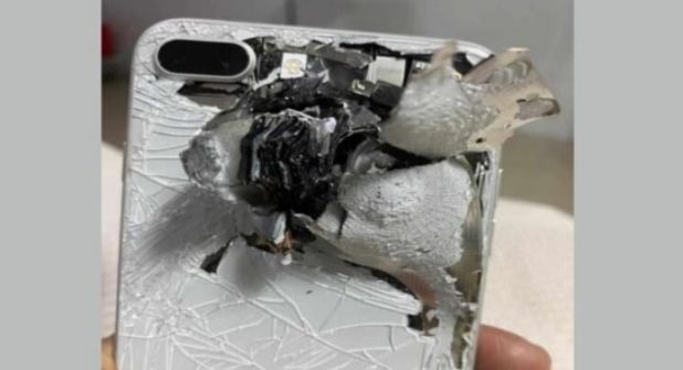 Se observa que el iPhone de color blanco con gris quedó destrozado por dentro; sus componentes y pila están destruidos muy cerca de la cámara.