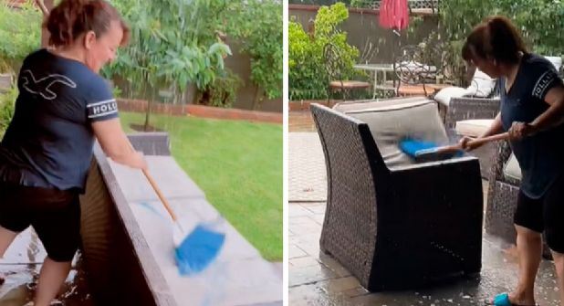 A través de un video en TikTok se observa como la ama de casa no se inmuta ante la fuerza del huracán Hilary, beneficiándose de las potentes lluvias para darles un "remojón" a varios muebles sucios que tenía en casa. Las imágenes muestran como, armada con una escoba, la mujer comienza a lavar un sillón grande, sacándole toda la mugre que puede.