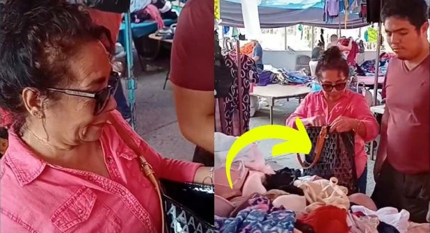 La mujer, aparentemente de la tercera edad, llegó al puesto de ropa con una bolsa grande y que acomodaba de cierta manera para poder echar las prendas adentro, para sorpresa de la mujer estaba siendo captada casi desde que llegó.
