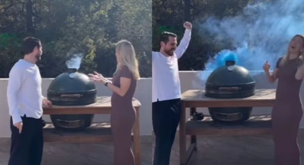 En el video compartido en Instagram, se observa a los felices padres revelar el género de su hijo, un varón, de acuerdo al humo azul que sale de un asador para carnes. Así, con una carnita asada, festejaron junto con sus invitados la próxima llegada del bebé a la familia.