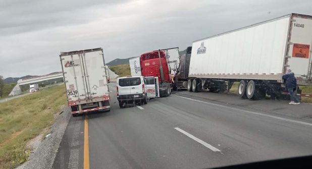 En la autopista Monterrey Nuevo Laredo se ha registrado un accidente en las primeras horas de este sábado 19 de octubre en el percance vial se ha involucrado a una camioneta tipo van y tres tractocamiones por lo que la vía fue cerrada a la circulación por unos minutos para dar atención a los involucrados.