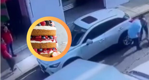 La grabación, que dura solo unos segundos, muestra a la mujer saliendo de una tienda con el pastel en mano y dirigiéndose a su camioneta estacionada en la acera de enfrente.