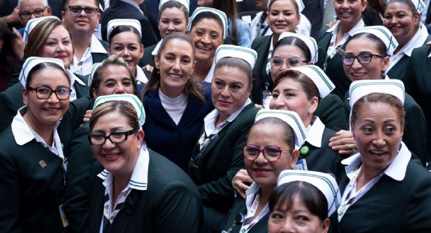 Durante su mensaje, la Jefa del Ejecutivo Federal reconoció de manera muy especial a todas las mujeres trabajadoras del IMSS, quienes además de atender a las y los derechohabientes también laboran en sus hogares para fortalecer a sus familias.