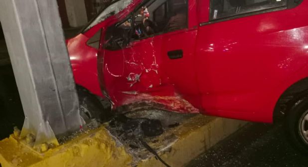 El joven manejaba un Chevvrolet Spark en color rojo, cuando por ir manejando a exceso de velocidad chocó con un señalamiento bandera y el golpe fue de su lado. En el vehículo habían platos con restos de alimentos.