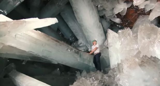 En la Sierra de Naica, en Chihuahua, se encuentra esta espectacular cueva, para acceder hay que subir la montaña y posteriormente descender unos 300 metros bajo la superficie. Mientras más se baja al lugar, se vuelve más peligroso.