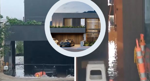Los videos que circulan en redes sociales comparten la imagen de la costosa casa que será rifará este sábado 22 de junio. La pendiente llevó el agua hasta el interior de la primera planta de la casa, la cual primero entró por la cochera.