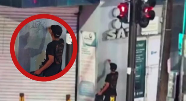 Un joven fue sorprendido por oficiales de la Policía de Monterrey cuando se encontraba rayando la pared de las instalaciones del SAT, esto en el primer cuadro de la ciudad, razón por la que fue detenido.