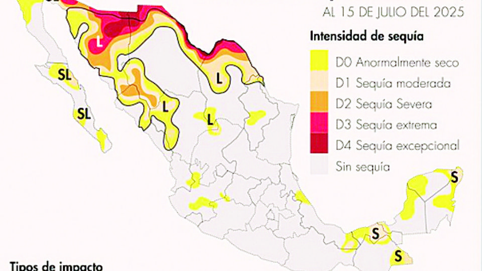 El 4.6 está bajo sequía excepcional, la más alta, 9.6 por ciento en sequía extrema, 7.6 en sequía severa, 13.1 en sequía moderada y el resto, 11.8 por ciento, “excepcionalmente seco”.