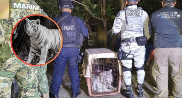 Un tigre de bengala fue asegurado por la Fiscalía General de la República (FGR) dentro de un inmueble ubicado en el municipio de Coatzintla, Veracruz, durante un cateo realizado con apoyo de la Secretaría de Marina.