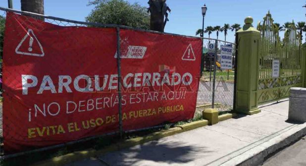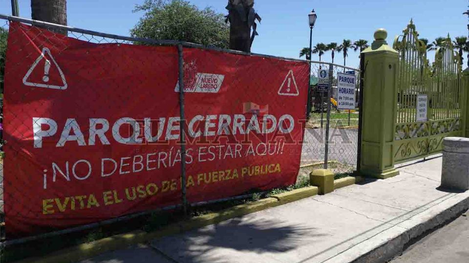 "PARQUE CERRADO ¡No deberías estar aquí! EVITA EL USO DE LA FUERZA PÚBLICA. Con estos mensajes en grandes lonas rojas en algúnas de las entradas principales en los parques de Nuevo Laredo el gobierno municipal optó por esta medida para evitar la aglomeración de ciudadanos en este Domingo de Pascua o como se le conoce tradicionalmente en la frontera 'Día de la Coneja'.