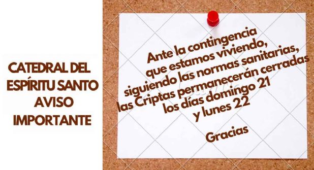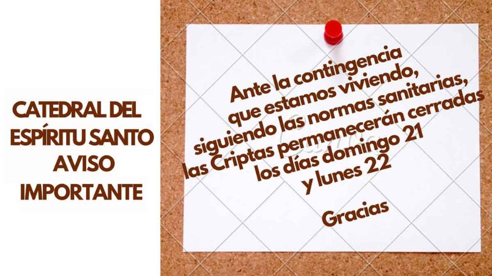 Debido a la contingencia de la pandemia de covid-19 y el aumento de contagios de coronavirus en la ciudad y el estado la Catedral del Espíritu Santo informó mediante un aviso en sus redes sociales que las criptas que se encuentran en la planta baja del edificio permanecerán cerradas el domingo 21 y el lunes 22 de junio.