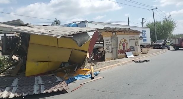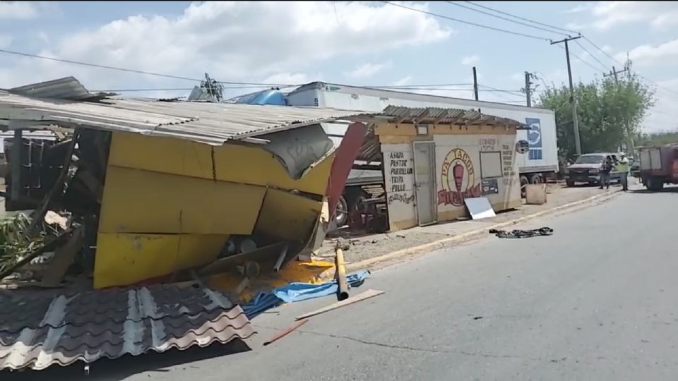 Un trailer que circulaba por la Carretera Nacional a la altura del Kilometro 12 termino arrollando dos puestos de comida que se encuentran ubicados enfrente del Panteón de los Ángeles, mismos puestos que quedaron completamente destrozados al momento del impacto de la unidad de transporte.