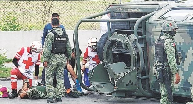 Dos militares de la Secretaría de la Defensa Nacional (Sedena) resultaron lesionados, al registrarse un choque con volcadura en la avenida César López de Lara, luego de que el chofer de la patrulla volcada atravesó por una bahía con boyas. Los soldados heridos fueron atendidos por paramédicos de Protección Civil y Bomberos, así como de la Cruz Roja Mexicana y después trasladados por militares de sanidad al Hospital México-Americano.