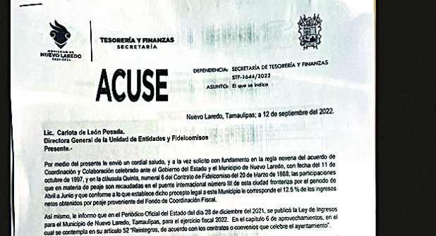 El Gobierno del Estado debe al Ayuntamiento de Nuevo Laredo 32 millones 133 mil 159.63 pesos, recursos derivados del peaje del Puente III y por reembolso del pago a Banobras, correspondientes al último año en que ha estado al frente la administración de Carmen Lilia Canturosas.