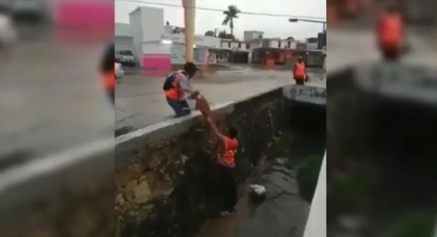 Trabajadores rescataron a perrito de un canal pluvial en Tampico, quedando registrada su heroica hazaña a través de un video subido a redes sociales.