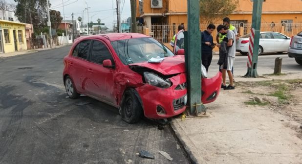 Por no respetar la luz roja, el chofer de un Nissan March 2012 choca contra una camioneta Cadillac, y después del impacto, termina estampado contra el poste del semáforo, lesionando a sus acompañantes, una mujer y su hijo menor de edad.