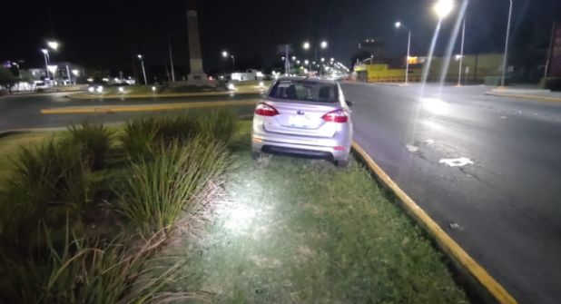 Pasando la calle Sonora, el chofer del carro Fiesta se descontrola y se impacta contra el cordón de concreto del camellón o triángulo ubicado en el crucero y se trepa en el mismo.