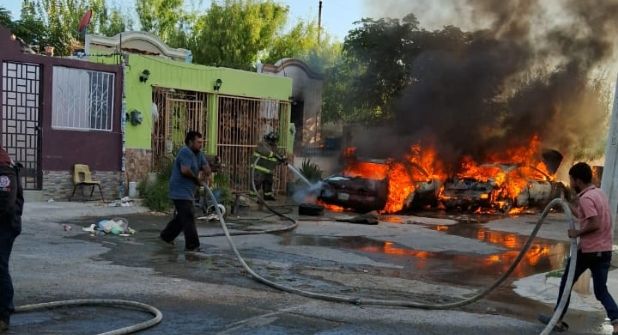 Bomberos y paramédicos llegaron hasta la casa ubicada en las calles de Paloma y Gaviota de la colonia mencionada, observando que el fuego consumía dos automóviles.