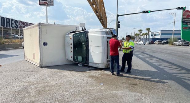Un camioncito de tres y media toneladas quedó volcado sobre uno de sus costados, luego de que su conductor no midió correctamente la altura reglamentaria y chocó contra la barrera metálica en un crucero de la Carretera Aeropuerto y Anzures, frente a la colonia Los Fresnos.