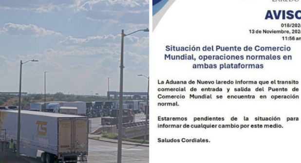 "La Aduana de Nuevo Laredo informa que se habilitaron carriles para el cruce de vehículos de importación y Exportación en la Aduana de Colombia que procesará operaciones con pedimentos de la Aduana de Nuevo Laredo (240) por un lapso de 48 horas”, dice el comunicado de la ANAM.