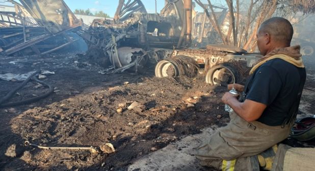 Las llamas alcanzaron aproximadamente diez cajas y los tráileres estacionadas en los patios, consumiéndolos y levantando enormes bolas de humo visible a varios kilómetros de distancia.