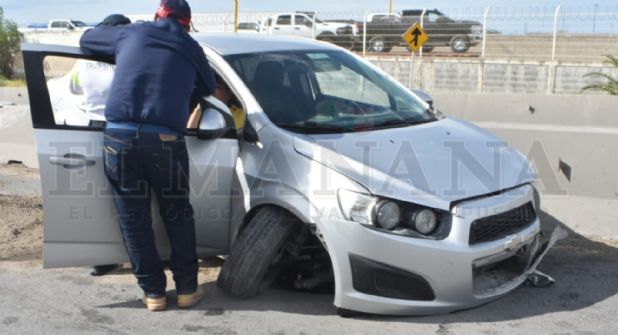 Por causas desconocidas, la conductora de un auto Chevrolet Sonic se descontroló al subir el puente de la Carretera Aeropuerto, impactándose contra los muros de contención y en su defensa, la damita dijo que otro carro le pegó y se dio a la fuga.