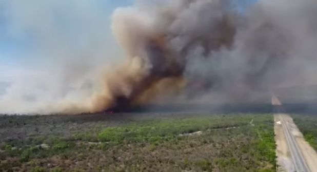 El fuego consume grandes extensiones de terreno y afecta la visibilidad en las carreteras cercanas.