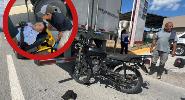 Un motociclista resultó con lesiones de consideración tras estrellarse de manera inexplicable contra la caja de un tráiler, cuyo chofer se encontraba detenido esperando que le abrieran el portón para ingresar a una línea de transportes en la Carretera Aeropuerto.