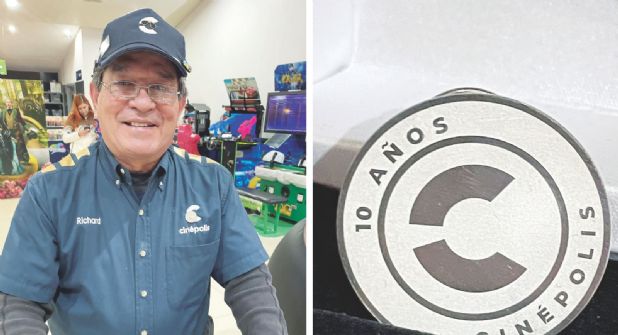 Muy contento de haber cumplido 10 años como trabajador en el cine del centro comercial Paseo Reforma, Ricardo Trujillo, mejor conocido como don Richard, porta la insignia de la cadena de cines que le otorgó por su décimo aniversario laboral.