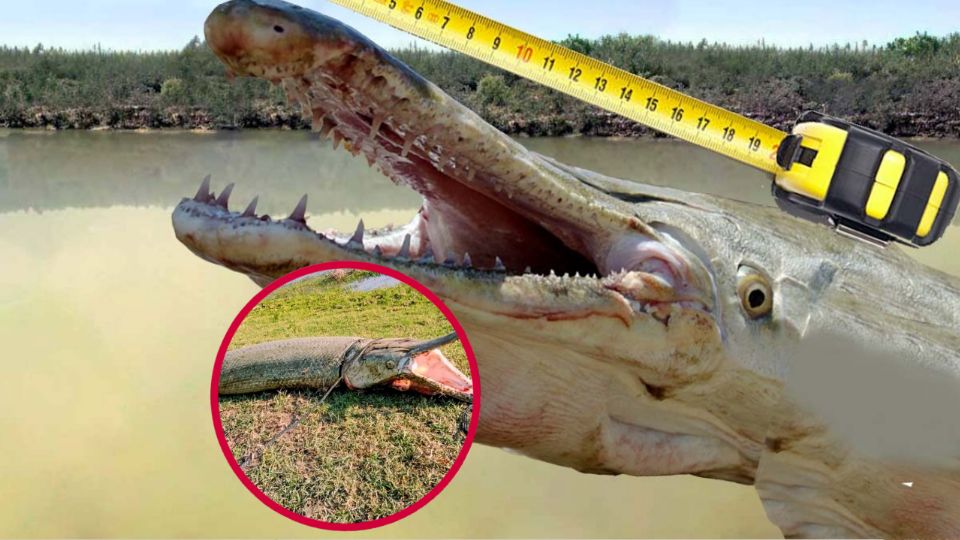 Las imágenes no mienten. El animal es una verdadera bestia del río: el ejemplar es tan grande que se necesitaron dos personas para manipularlo y un tronco para mantener su mandíbula, llena de dientes, abierta. Su cuerpo acorazado nos recuerdan por qué es considerado el rey de los caudales en el noreste de México.