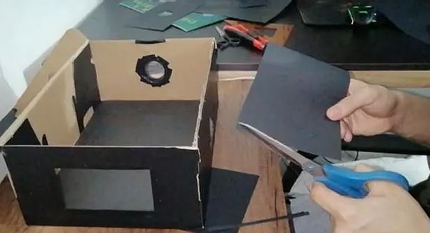 - Prepara la caja: Corta un agujero rectangular en uno de los extremos de la caja. Si deseas una imagen proyectada más grande, puedes unir dos cajas juntas para formar una más larga.